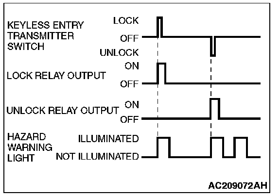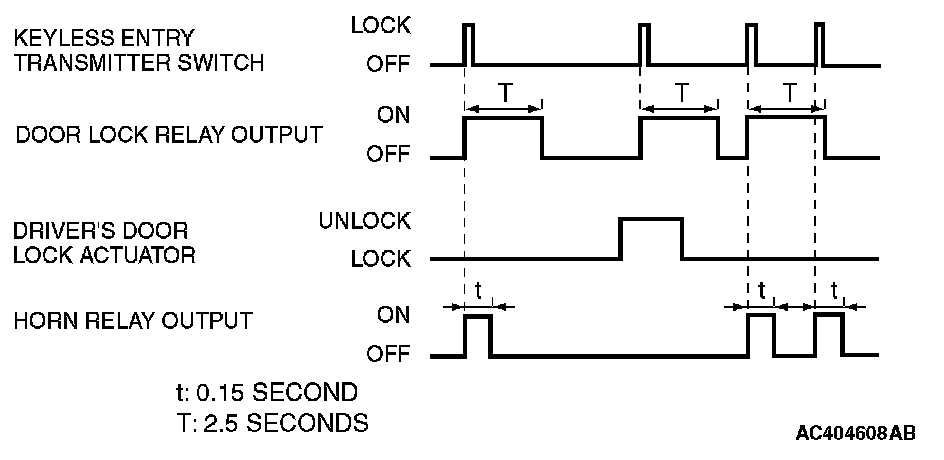 When the lock signal from the keyless entry transmitter is received into ETACS-ECU, all doors are locked and the horn sounds. If the driver's door cannot be locked even when the keyless entry transmitter is operated, the horn does not sound.