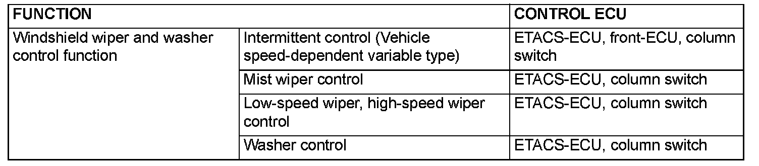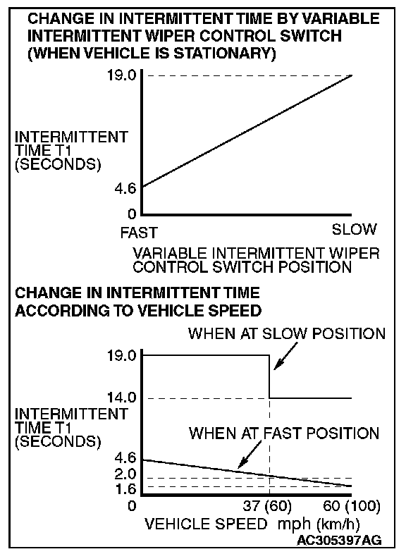ETACS-ECU uses the dial position of the variable intermittent wiper control switch and the vehicle speed signal sent by the combination meter to calculate the interval to be sent to the front-ECU.