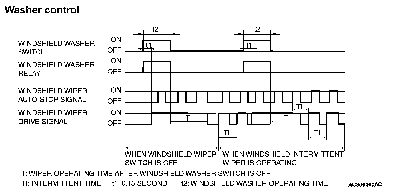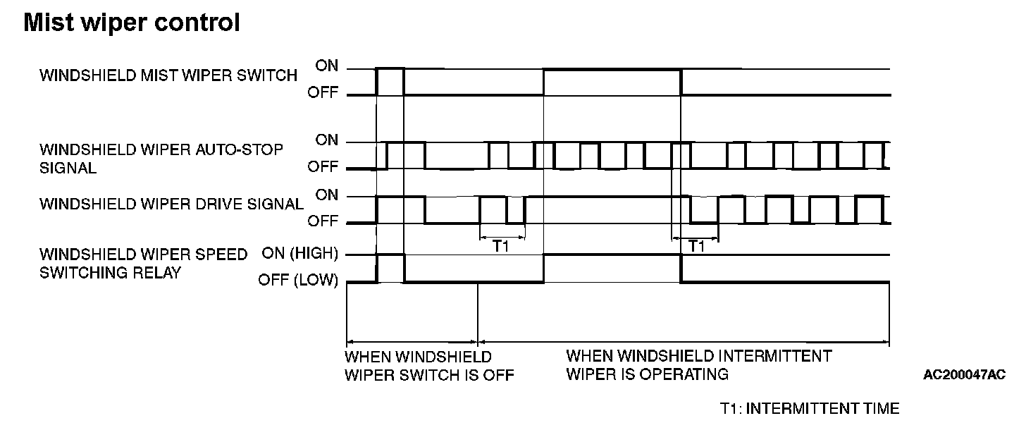 At the point the windshield mist switch is turned ON, if the windshield wiper has been operating intermittently, the same operations as the above will be performed while the windshield mist wiper switch is ON. After the windshield mist wiper switch goes OFF, the intermittent operations will be set again T1 seconds after the last windshield wiper auto-stop signal turning ON.
