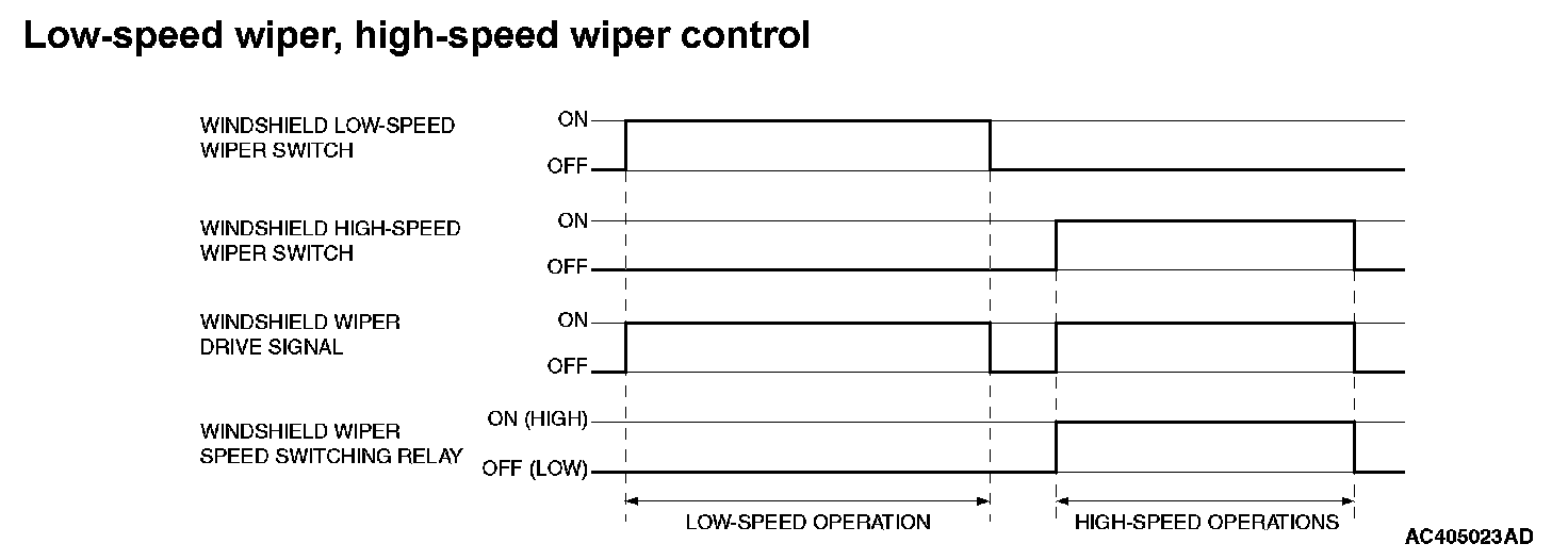 When the ignition switch in at the ACC or ON position, and the windshield low-speed wiper switch of the column switch is turned ON, the front-ECU turns ON the windshield wiper drive signal, turns OFF (LOW) the windshield wiper speed relay, and operates the windshield wiper at low-speed. Next, when the windshield high speed wiper switch is turned ON, the windshield wiper drive signal is turned ON, the windshield wiper speed switching relay is turned ON (HIGH), and the windshield wiper is operated at high-speed.