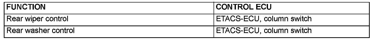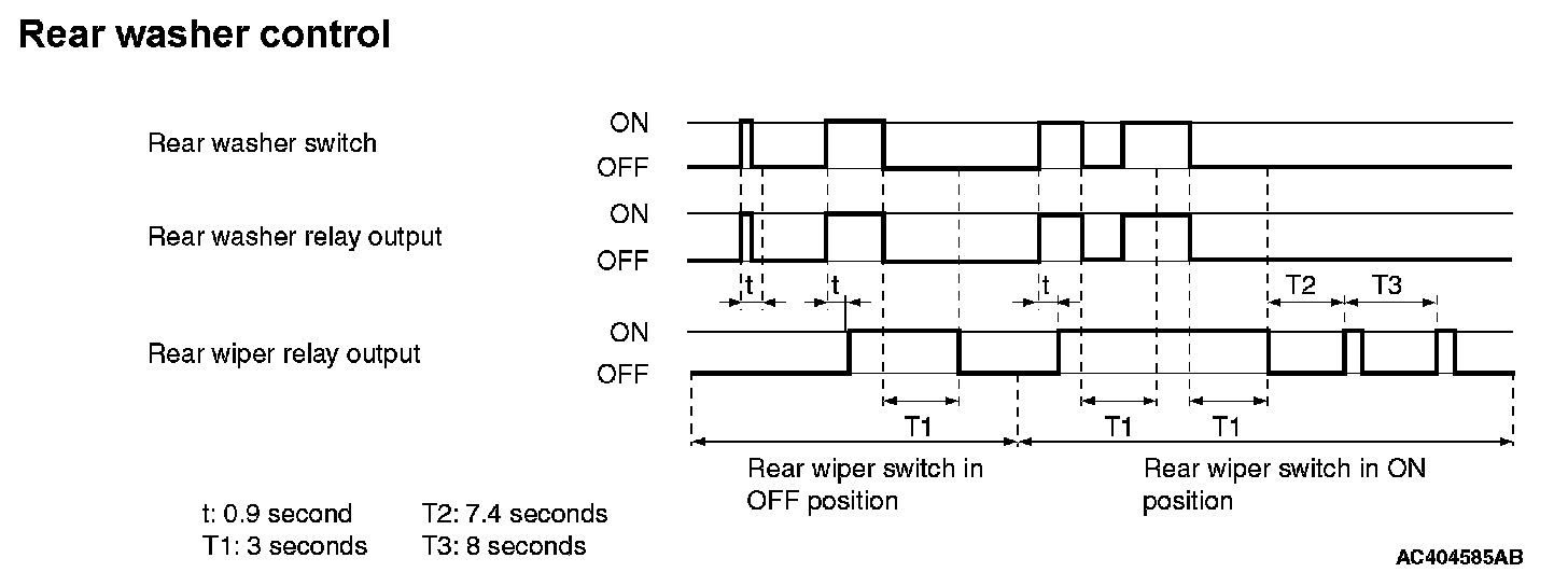 When the rear washer switch on the column switch is turned ON with the ignition switch ACC or ON, the ETACS-ECU turns ON the rear washer relay. If the rear washer switch remains ON for 0.9 second or more, the rear wiper operates. 3 seconds after the rear washer switch is turned OFF, the rear wiper is stopped. If the rear washer switch is turned ON during the intermittent operation of the rear wiper, the rear wiper operates along with the rear washer consecutively. 7.4 seconds after the rear wiper stops consecutive operation, it returns to the intermittent operation.