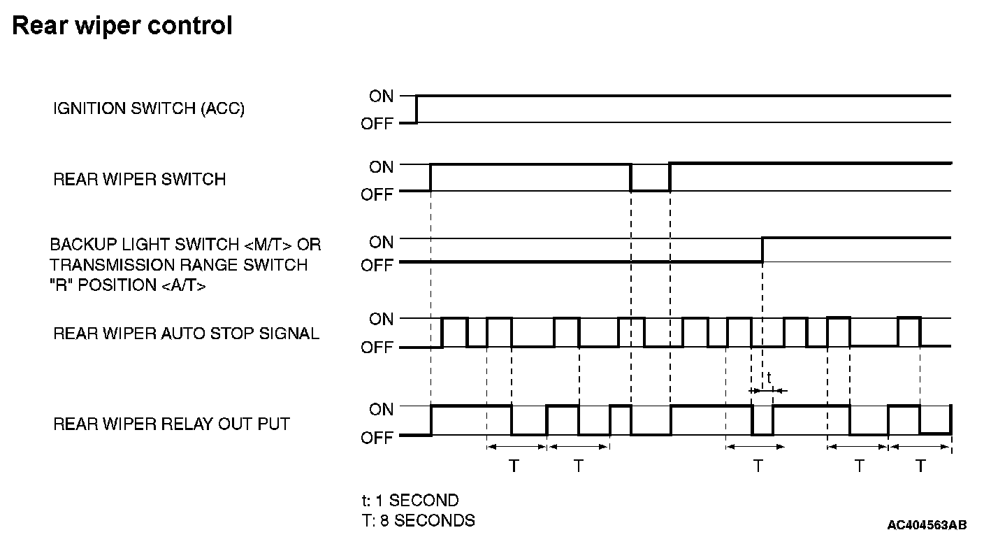When the rear wiper switch on the column switch is turned ON with the ignition switch ACC or ON, ETACS-ECU turns ON the rear wiper relay and operates the rear wiper twice consecutively. After that, operation continues at 8-second intervals.