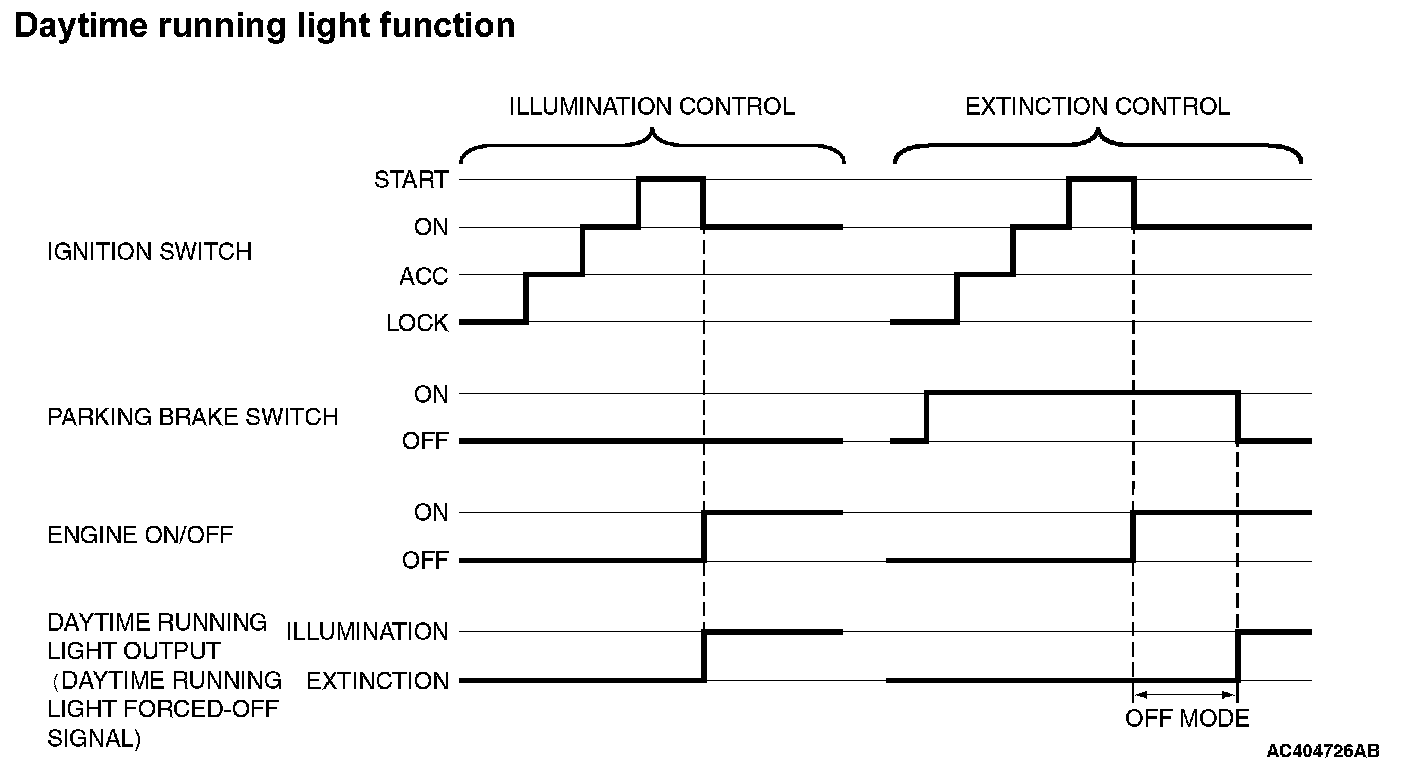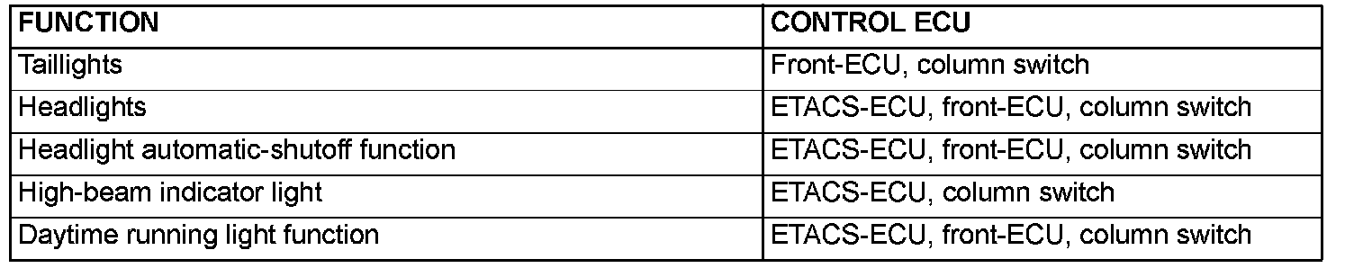 The ETACS-ECU outputs the daytime running light forced-OFF signal to the front-ECU based on the input signal sent via CAN communication. The front-ECU controls illumination and extinction of the daytime running light according to the daytime running light forced-OFF signal.