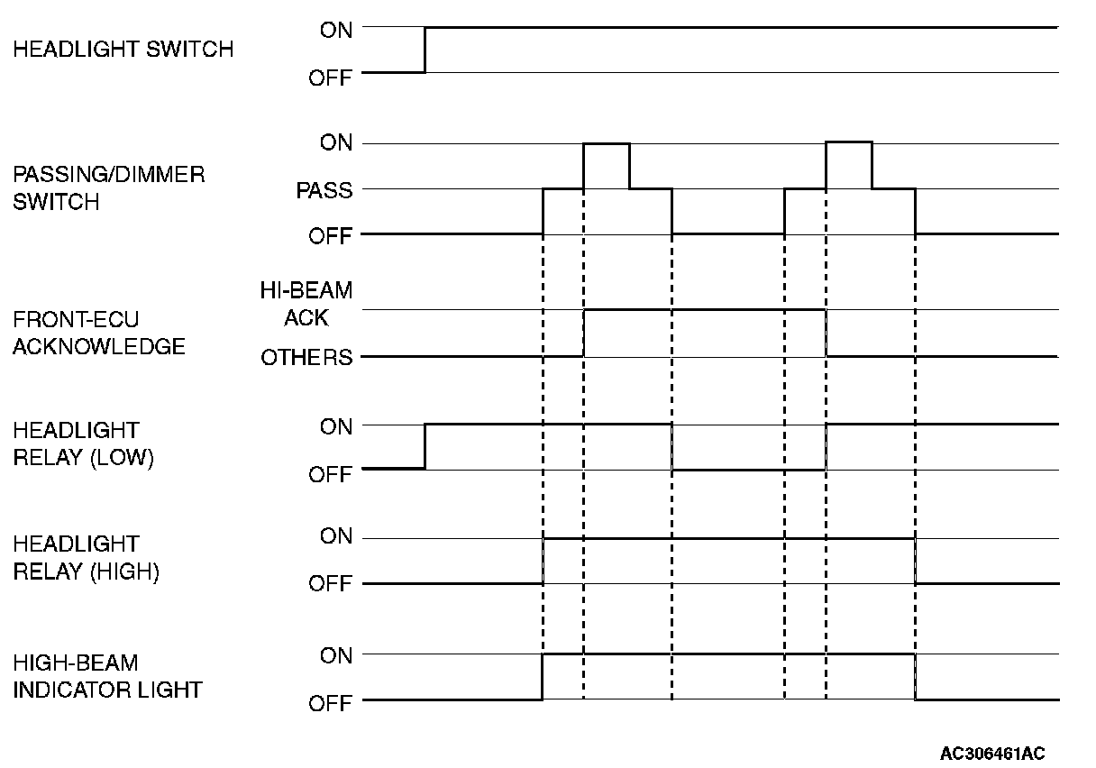 If the column switch sends a headlight switch "ON" signal to the front-ECU, the front-ECU turns on its headlight relay (LOW), causing the low-beam headlights to illuminate. If the dimmer switch is turned on while the headlight relay (LOW) is on, the front-ECU turns on the headlight relay (HIGH), causing the high-beam headlights to illuminate.