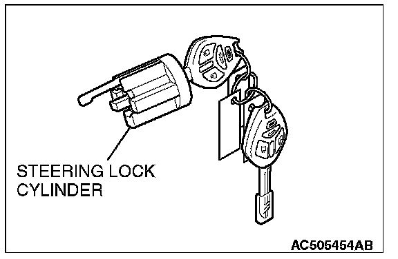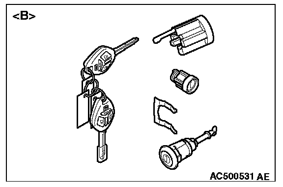 - When adding the ignition key separately, or replacing the components by the steering lock cylinder of illustration [A] (the ignition key is simultaneously supplied) or the key set of illustration [B], register the encrypted code.Refer to chassis electrical, Encrypted Code Registration Criteria Table.