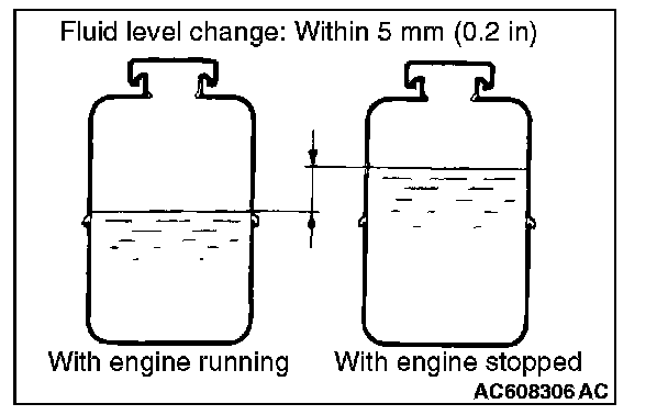 4. Check the fluid in the oil reservoir for foaming or milkiness. Check the difference of the fluid level when the engine is stopped, and while it is running. If the fluid contains air or has milky appearance, or the fluid level fluctuate by 5 mm (0.2 inch) or more, power steering system air bleeding should be done.