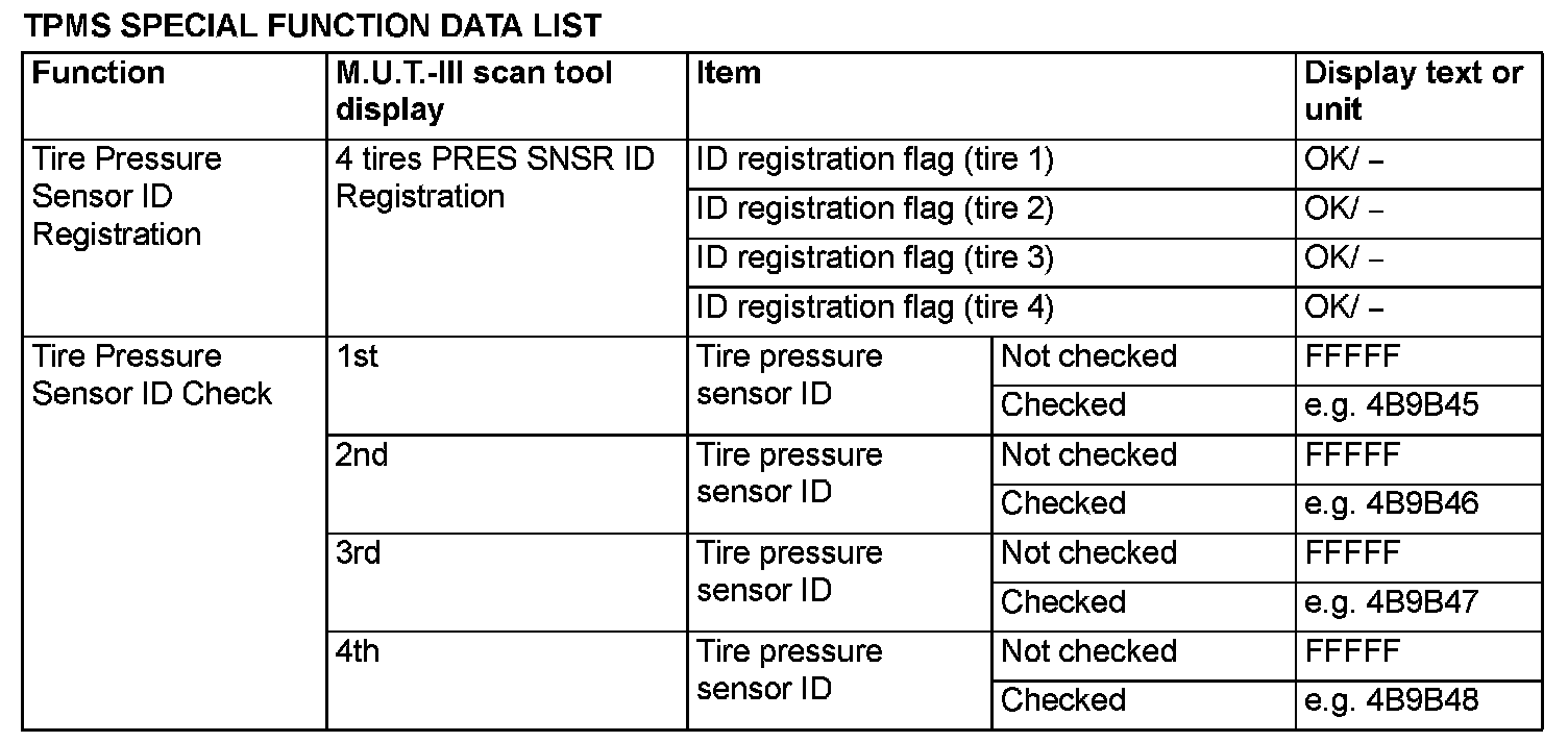 When the TPMS "Special Function" is executed, the TPMS receiver uses the data below.