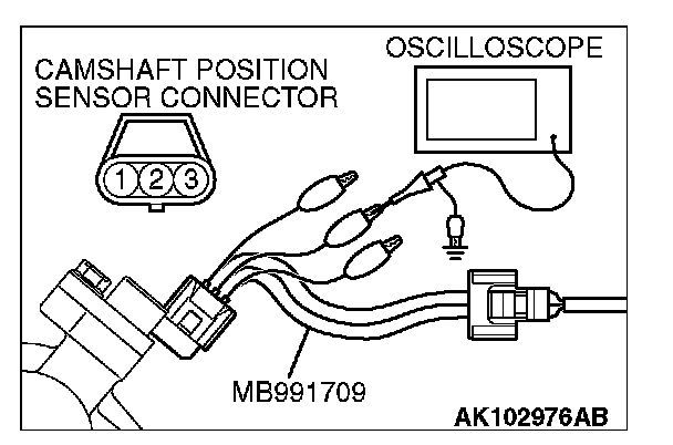 1. Disconnect the camshaft position sensor connector and connect the test harness special tool (MB991709) between the separated connector (All terminals should be connected).
