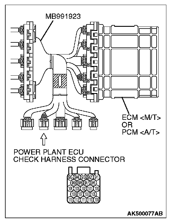 1. Disconnect all ECM [M/T] connectors or PCM [A/T] connectors. Connect the check harness special tool (MB991923) between the separated connectors.