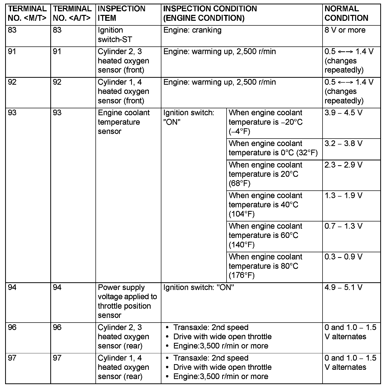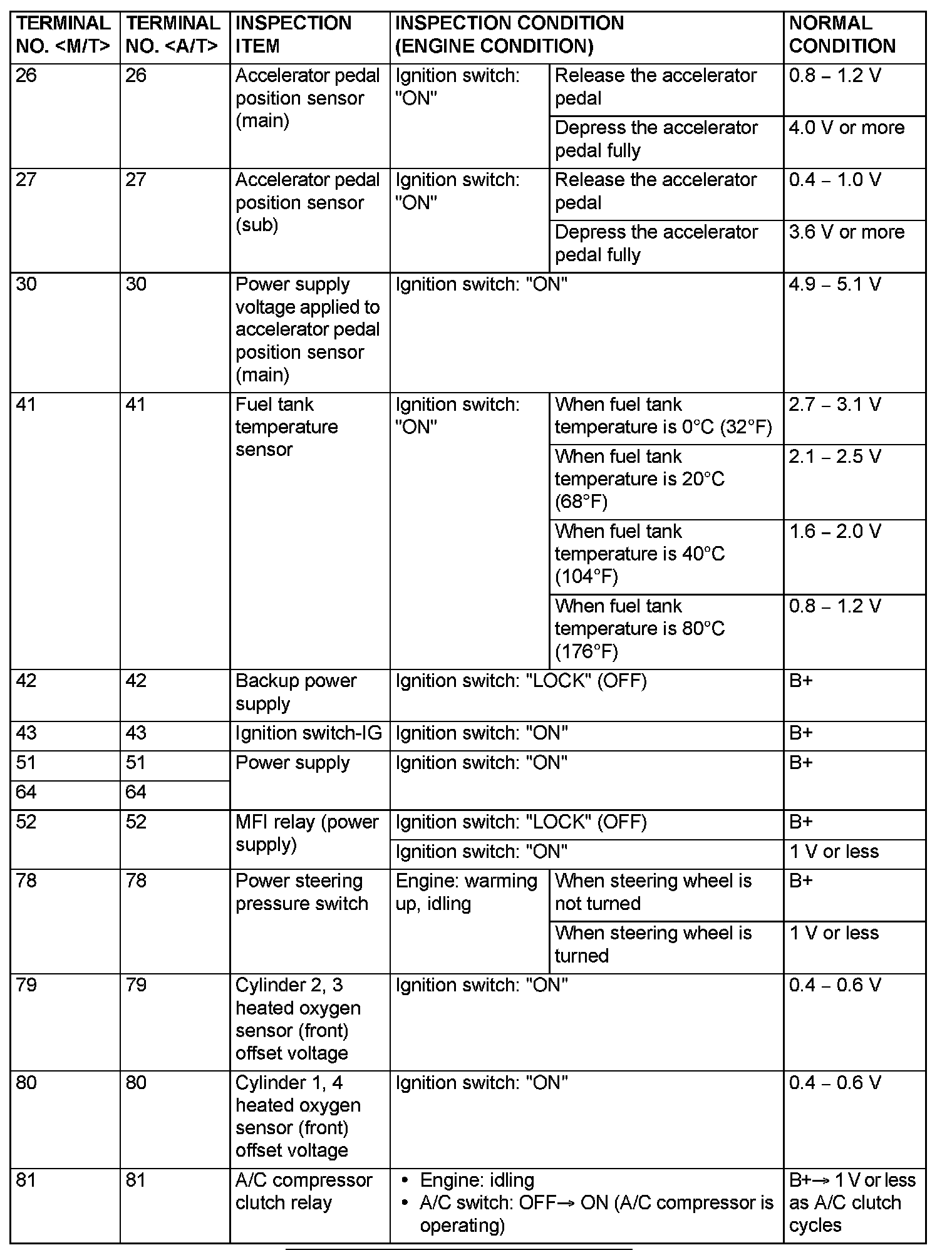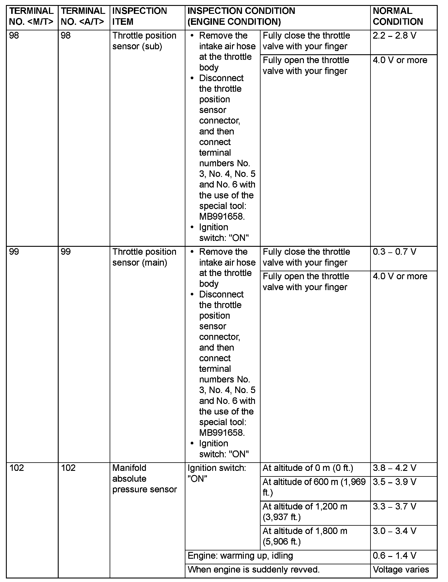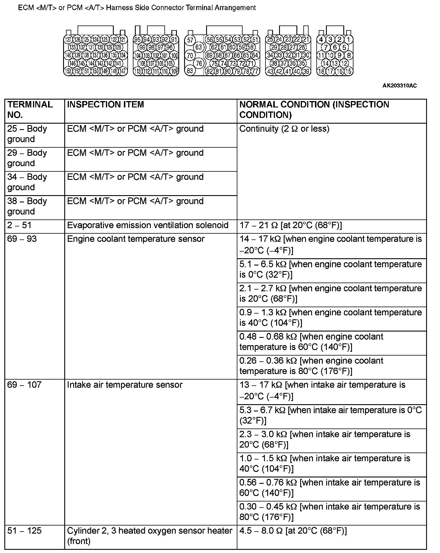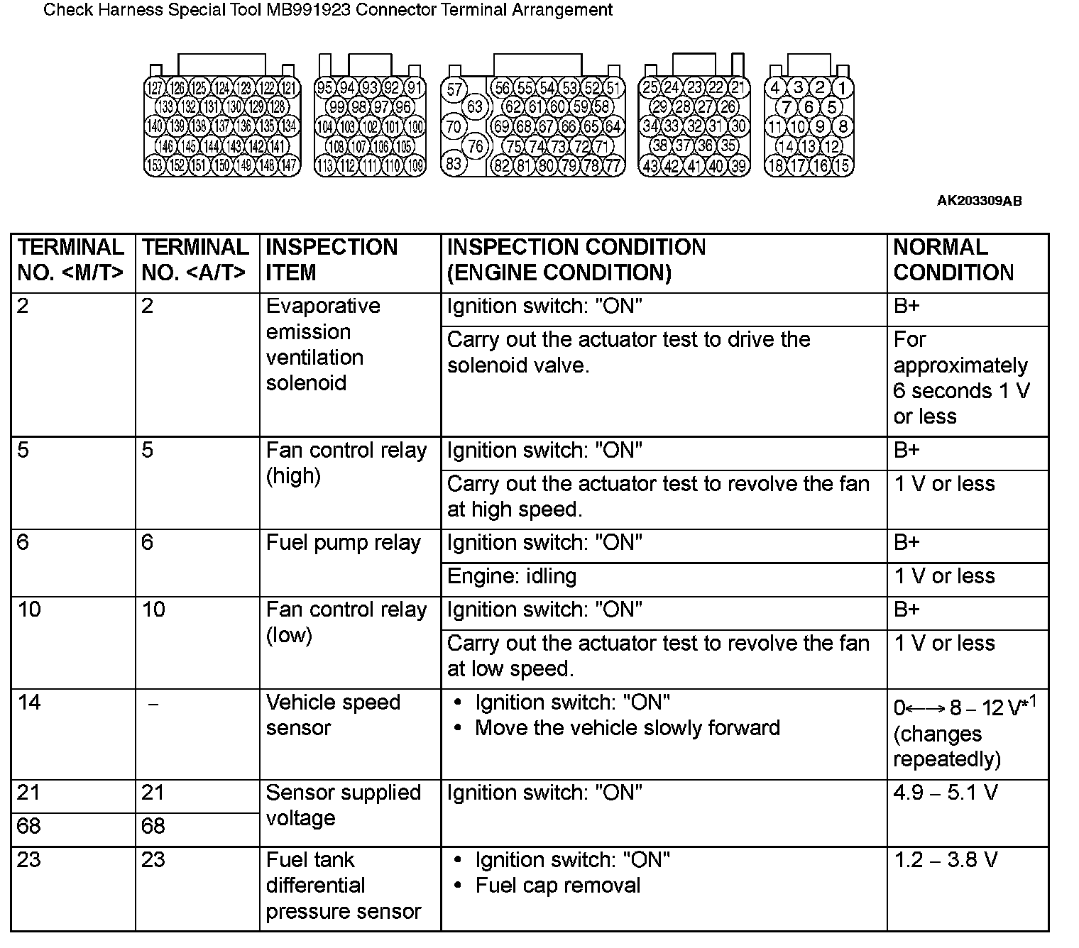CHECK AT THE ENGINE CONTROL MODULE (ECU) [M/T] OR THE POWERTRAIN CONTROL MODULE (PCM) [A/T]1. Disconnect the ECM [M/T] or the PCM [A/T] connectors B-18 B-19 B-20 B-21 and B-22 and connect check harness special tool MB991923 between the ECM [M/T] connectors or the PCM [A/T] connectors.