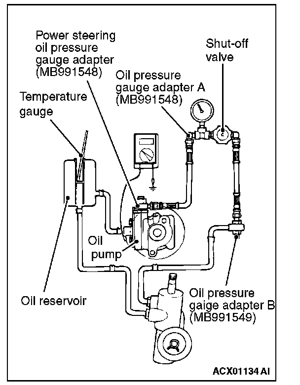 1. Disconnect the pressure hose from the oil pump, and then connect the special tools MB991548, MB990662 and MB991549.