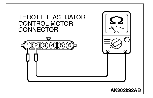 NOTE: If the measured resistance deviates from the standard value, fully open the throttle valve with your finger more than five times, then check the result again. If the throttle actuator control motor is not used for an extended period of time, the resistance may be increased as a result of internal forming of oxide film. Therefore, it means that the oxide film can be removed through a self cleaning capability of the throttle actuator control motor; if forcibly moved.