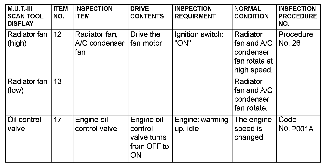 Actuator Test Reference Table