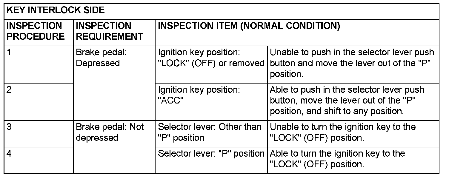 KEY INTERLOCK AND SHIFT LOCK MECHANISM CHECK1. Carry out the following inspection.