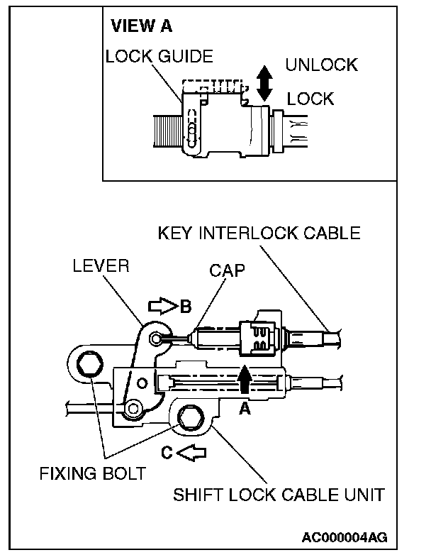 4) Loosen the bolt fixing the shift lock cable unit, push the lever in direction B and the unit in direction C and tighten the bolt at the standard torque.