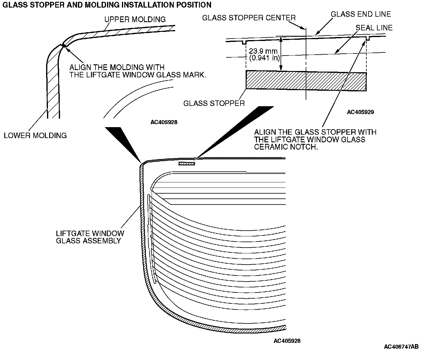 2. Assemble the glass stopper, lower molding and upper molding to specified positions on the liftgate window glass.