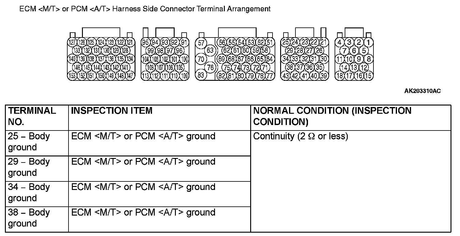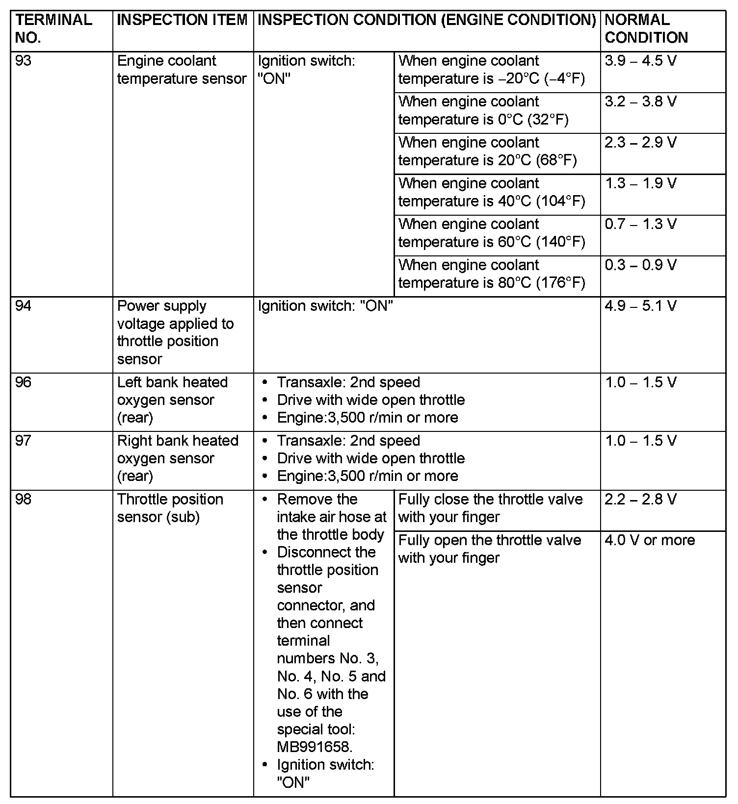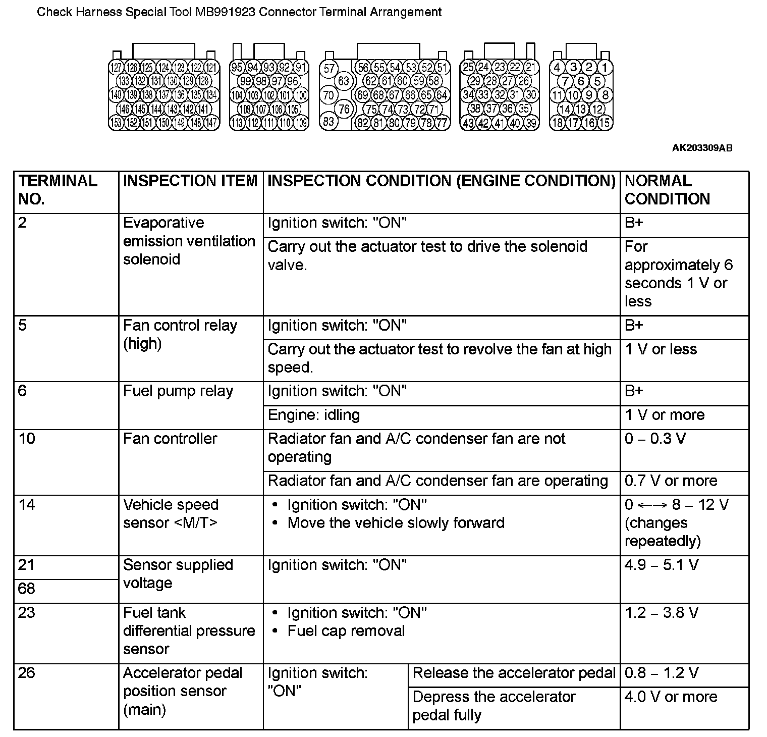 CHECK AT THE ENGINE CONTROL MODULE (ECM) [M/T] OR THE POWERTRAIN CONTROL MODULE [PCM) [A/T]1. Disconnect the ECM [M/T] or the PCM [A/T] connectors B-19, B-20, B-21, B-22 and B-23, and connect check harness special tool MB991923 between the ECM [M/T] connectors or the PCM [A/T] connectors.