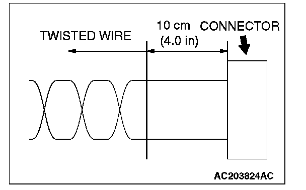 - If the connector or wire on the main bus line or the sub-bus wire is replaced, the strand end of the twisted wire should be within 10 cm (4.0 inches) from the connector. If it exceeds 10 cm (4 inches), twist the wiring harness just like the original twisted wire. If the strand end exceeds 10 cm (4 inches), noise suppression is deteriorated, causing a communication error.