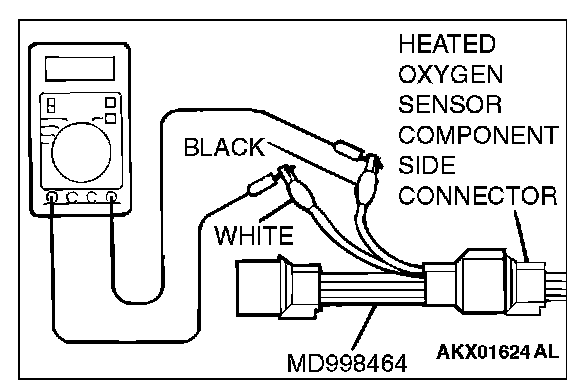 1. Disconnect the heated oxygen sensor connector and connect special tool MD998464 to the connector on the heated oxygen sensor side.