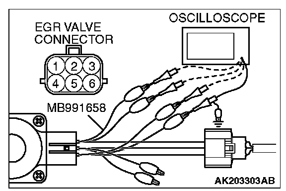 2. Connect the oscilloscope probe to the EGR valve connector terminal No. 1, terminal No. 3, terminal No. 4, terminal No. 6 respectively.