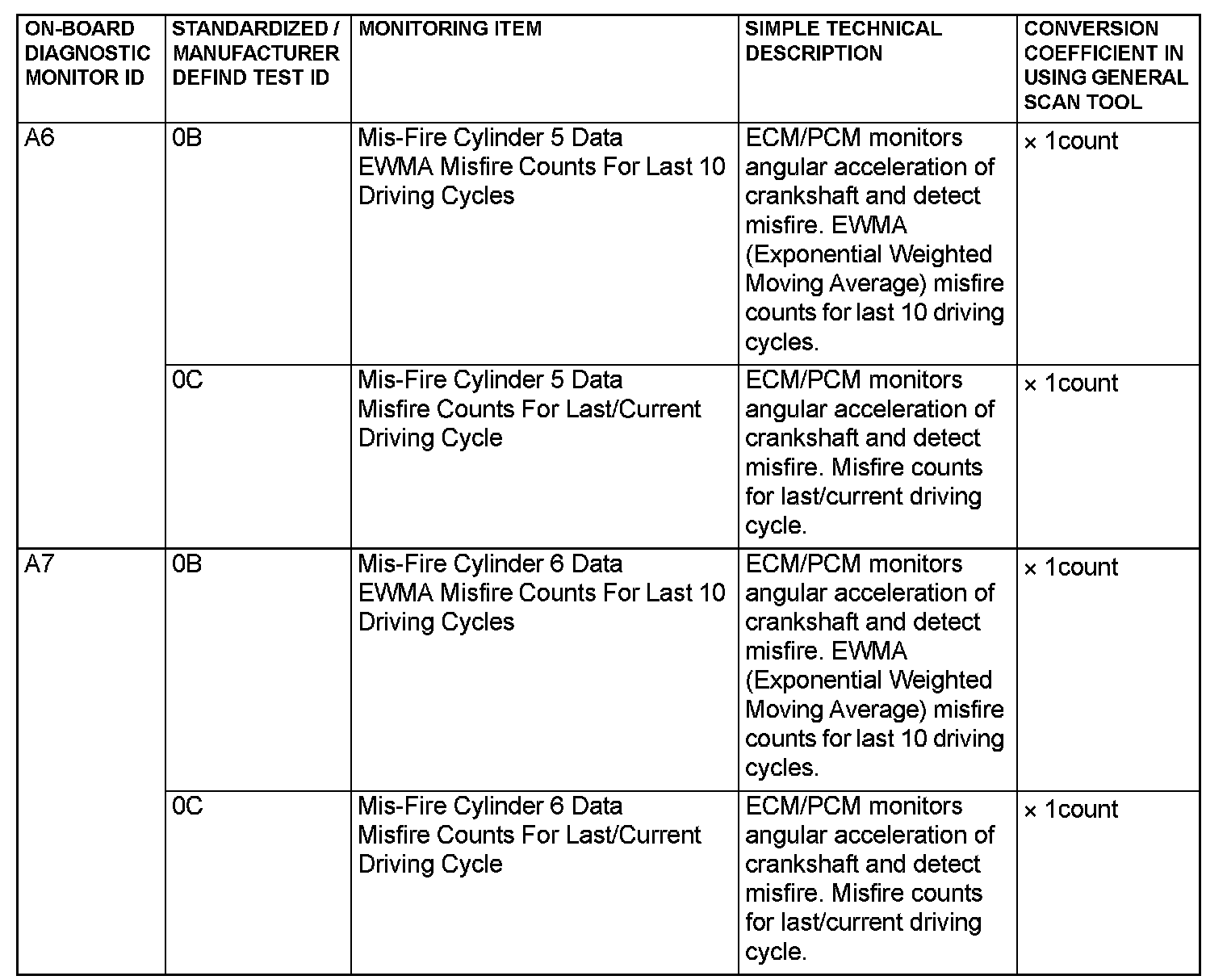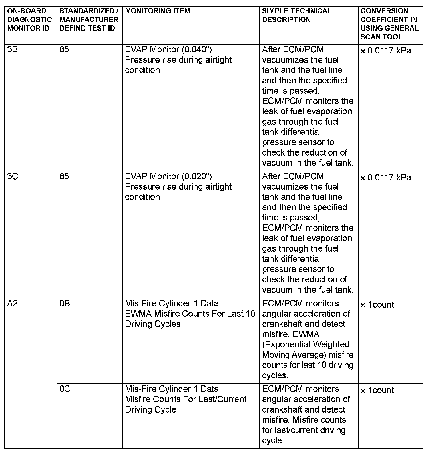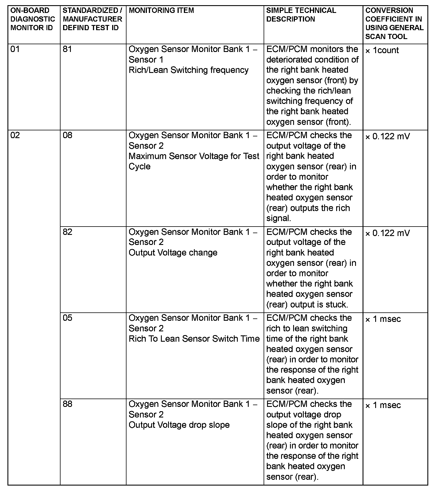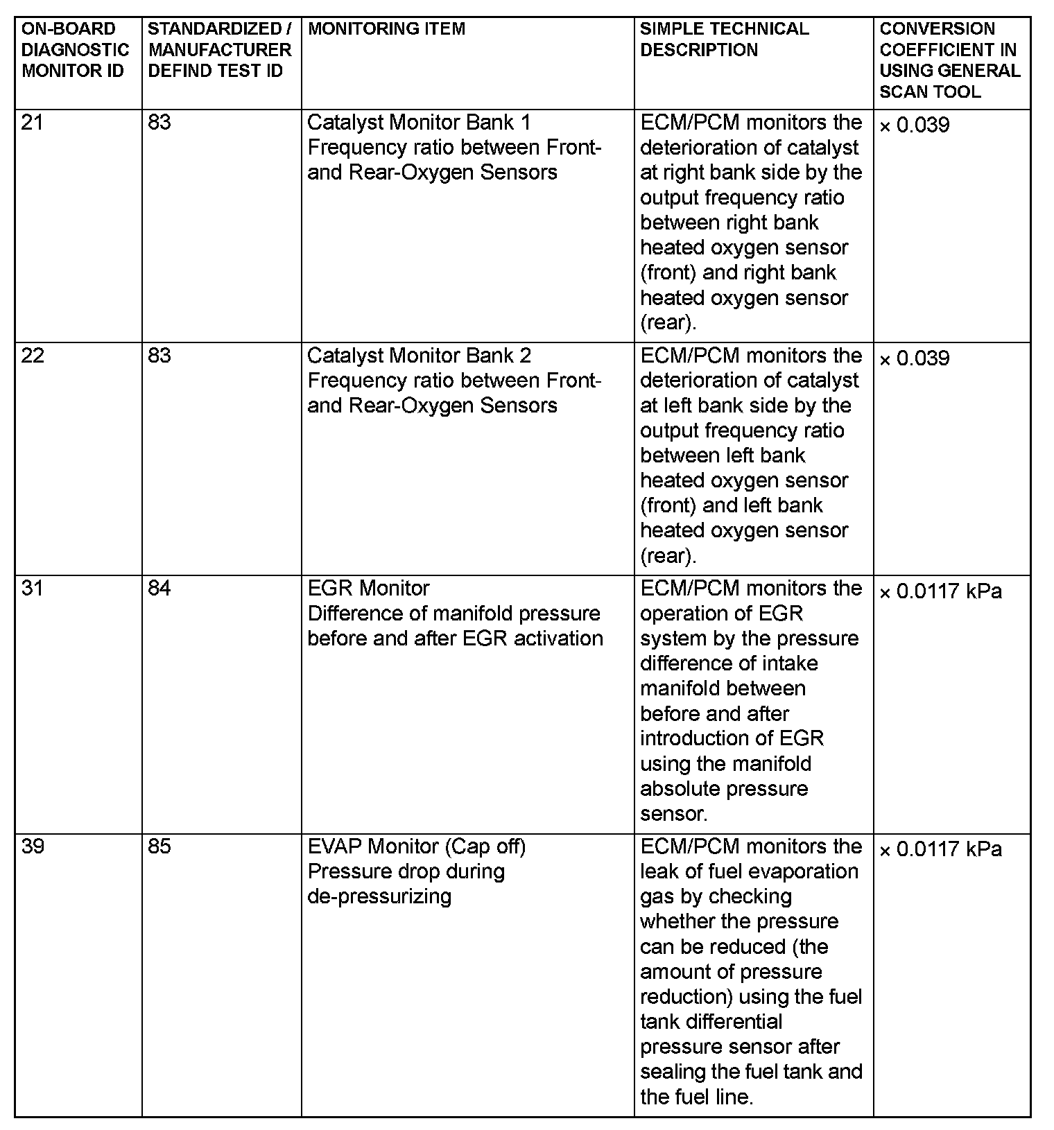 - When the monitored test results are erased by the battery disconnection and so on, the ECM/PCM outputs the values in hexadecimal of "0000" or "FFFF", otherwise it outputs abnormal values and so on. In case of this, the ECM/PCM outputs are handled as invalid-values. When the first monitor (Readiness Status) is completed after this, the ECM/PCM outputs the valid-values.