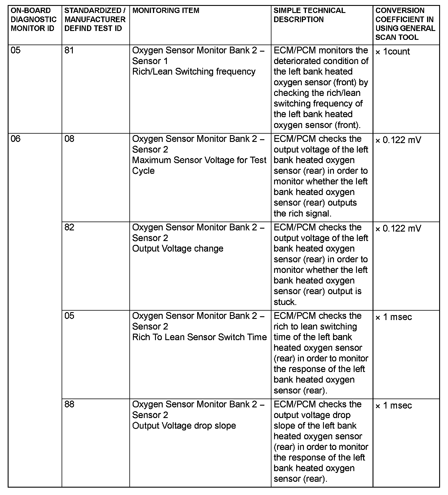 By selecting MODE 6 using scan tool, Test Result and Limit Value (minimum) *1 or (maximum) *2 about the main items of emission control system which ECM/PCM monitors can be confirmed. The value at the last monitoring is output by ECM/PCM as a test result.