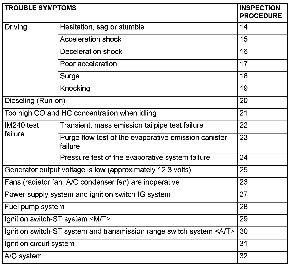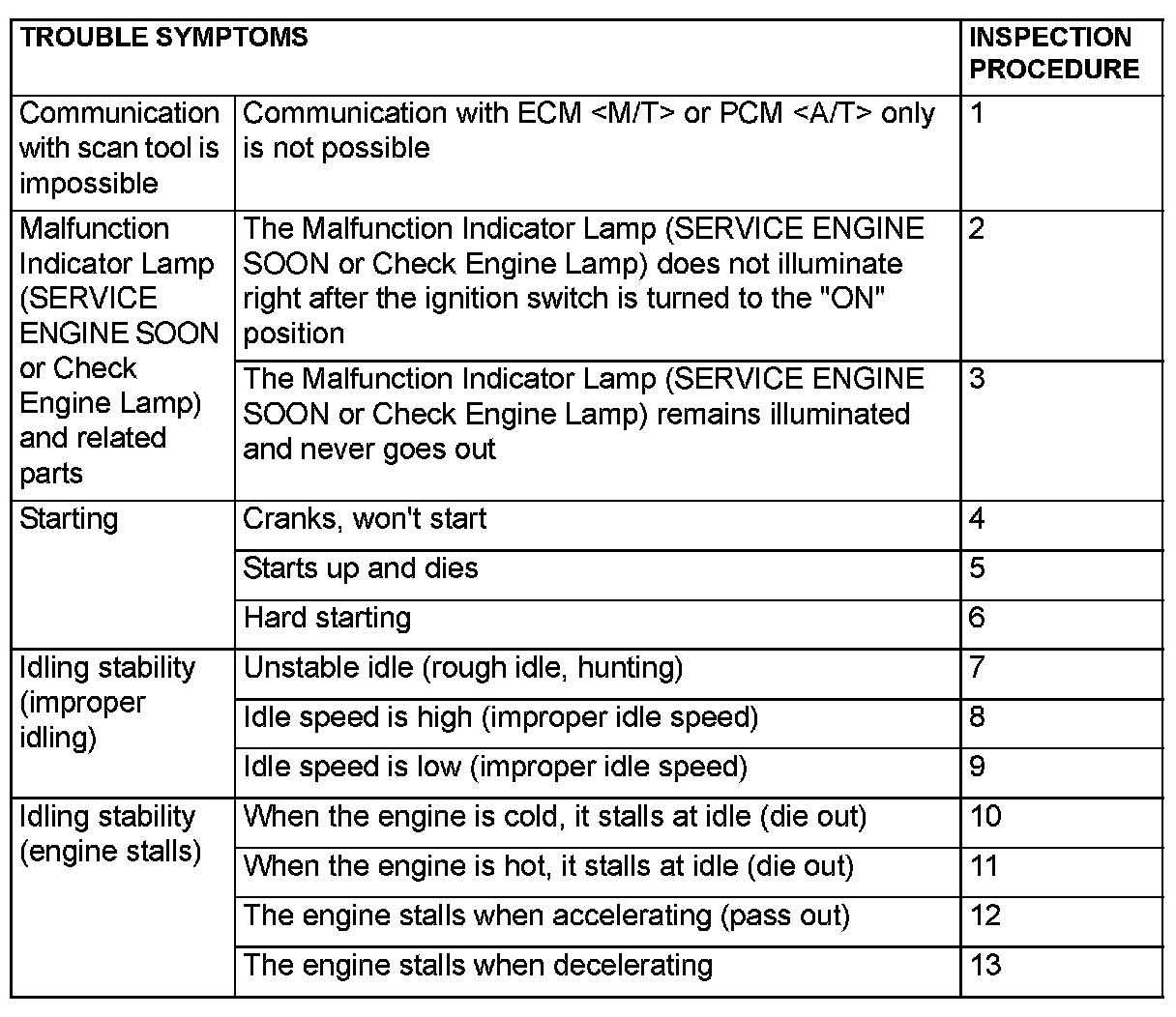 SYMPTOM CHARTWARNING: When touching the throttle valve, surely shut off the driving circuits of the throttle valve. In the event that the throttle valve is operated, a finger might be injured as the result of being caught by the throttle valve.