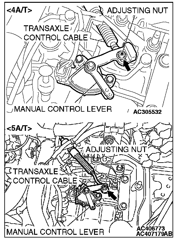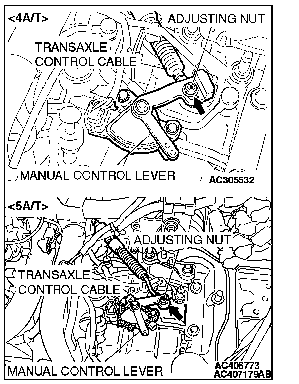 6. Gently push the transaxle control cable in the direction of the arrow, until the cable is taut. Tighten the adjusting nut.