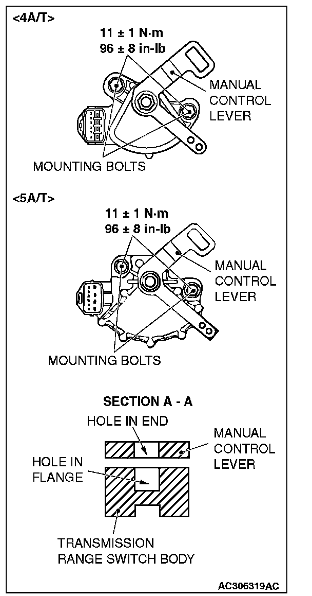 4. Loosen the transmission range switch body mounting bolts and turn the park/neutral position switch body so the hole in the end of the manual control lever and the hole (section A - A in the figure on the left) in the flange of the transmission range switch body flange are aligned.