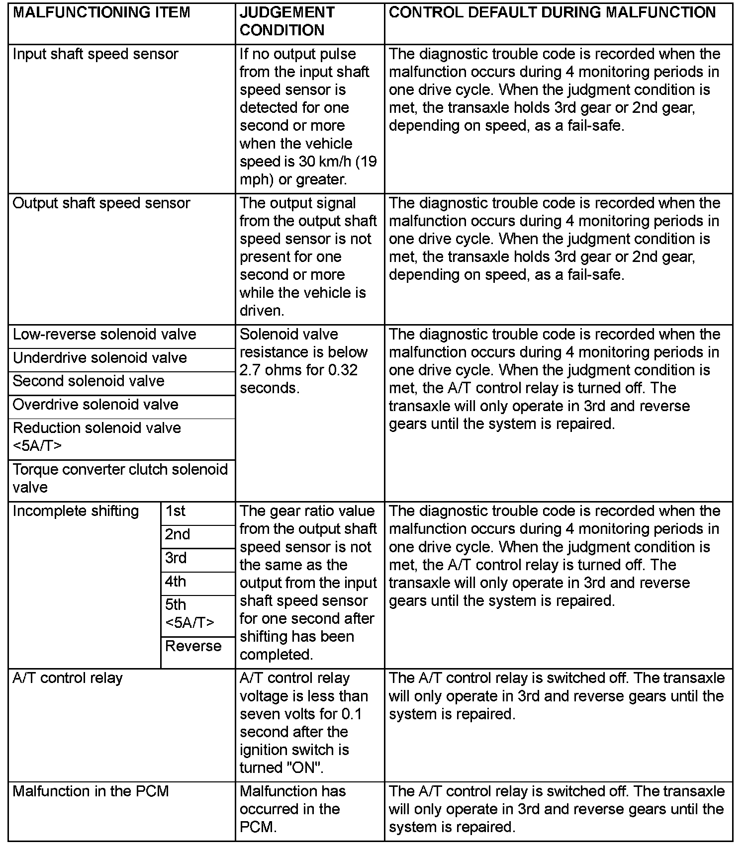 When a malfunction of a main sensor or actuator is detected by the PCM, the transaxle is controlled by pre-set control logic to maintain safe conditions for driving.