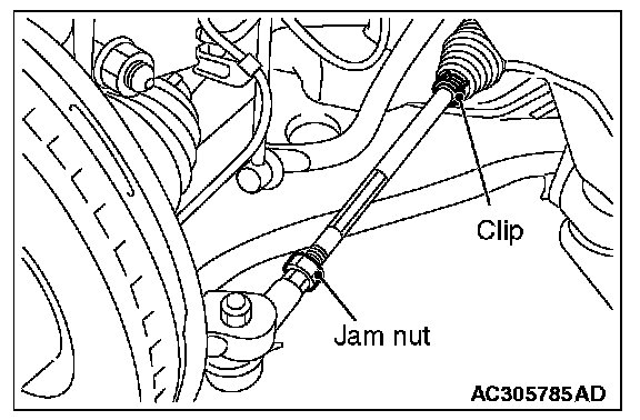 1. Adjust the toe-in by undoing the clip and jam nut, and turning the left and right tie rod turnbuckles by the same amount (in opposite directions).