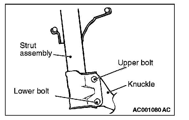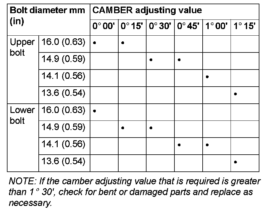 1. Estimate how much additional camber adjustment is required. Using the table below, select the camber adjusting bolt, and then replace the knuckle and strut assembly connection bolts (upper bolt, lower bolt) with the selected bolts.