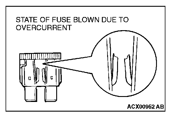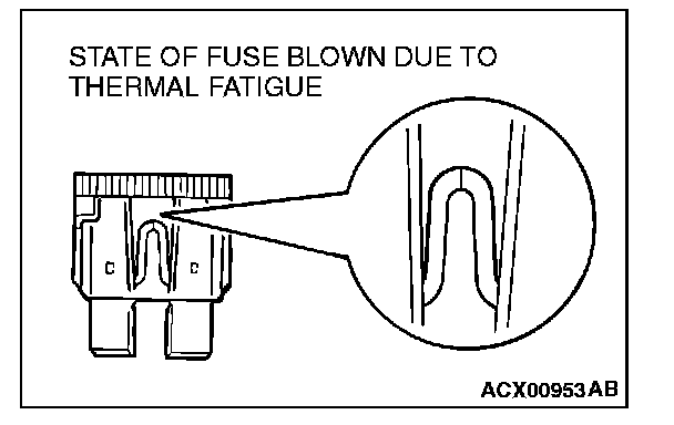 The illustration shows the state of a fuse blown due to this cause. In this case, do not replace the fuse with a new one hastily since a current heavy enough to blow the fuse has flowed through it. First, check the circuit for shorts and check for abnormal electric parts. After correcting shorts or replacing parts, use only a fuse of the same capacity as a replacement. Never use a fuse of larger capacity than the original fuse. If a larger capacity fuse is used, electric parts or wiring could be damaged, or could start a fire.