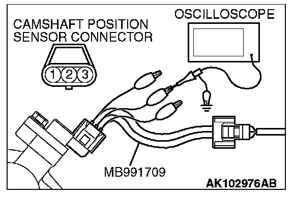 1. Disconnect the camshaft position sensor connector, and connect the test harness special tool (MB991709) between the separated connector (All terminals should be connected).