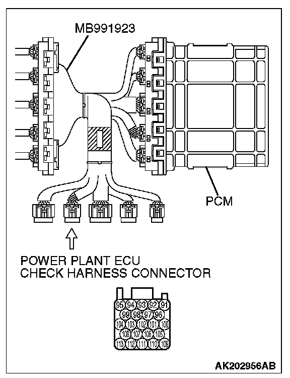 1. Disconnect all PCM connectors. Connect the check harness special tool (MB991923) between the separated connectors.