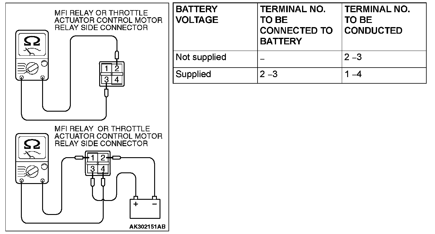 Inspect the MFI relay and throttle actuator control motor relay for continuity in accordance with the chart shown below.
