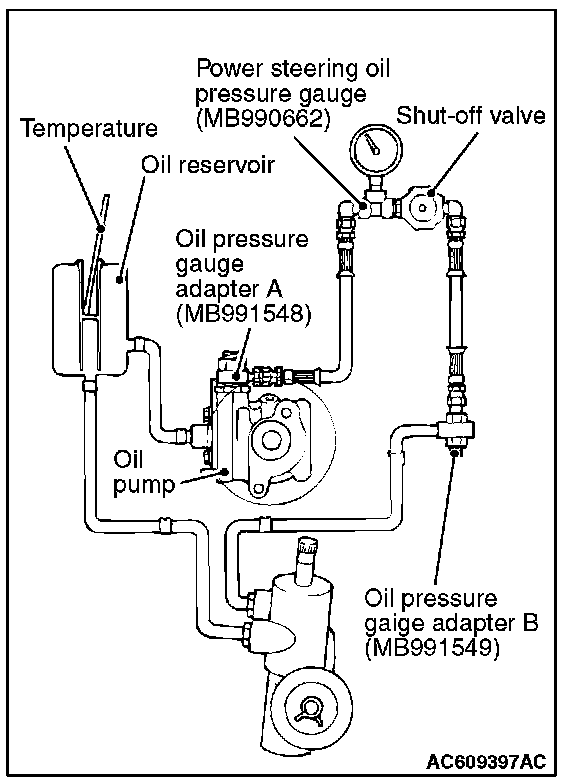 1. Disconnect the pressure hose from the oil pump, and then connect the special tools MB991548, MB990662 and MB991549.