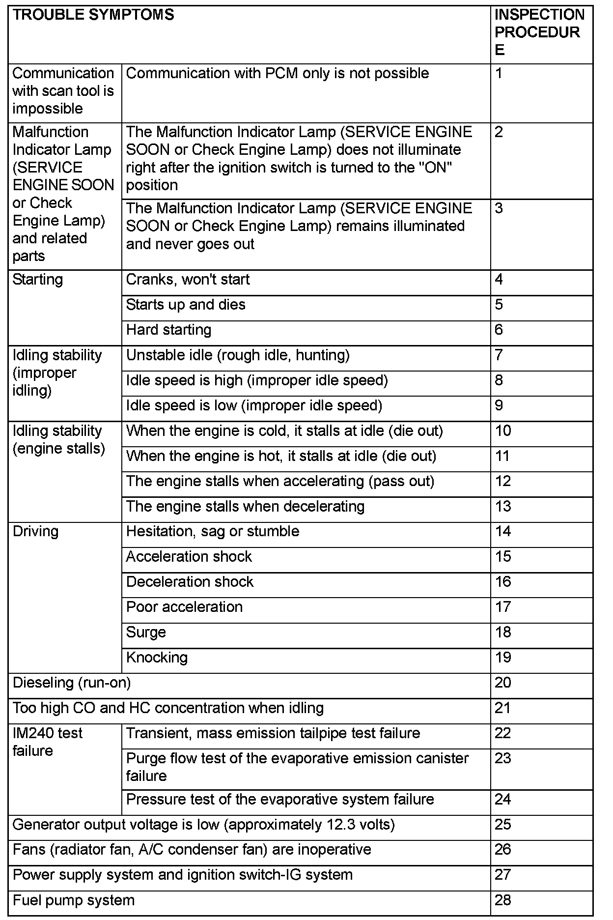 Symptom ChartWARNING: When touching the throttle valve, surely shut off the driving circuits of the throttle valve. In the event that the throttle valve is operated, a finger might be injured as the result of being caught by the throttle valve.