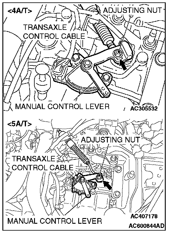 6. Gently push the transaxle control cable in the direction of the arrow, until the cable is taut. Tighten the adjusting nut.
