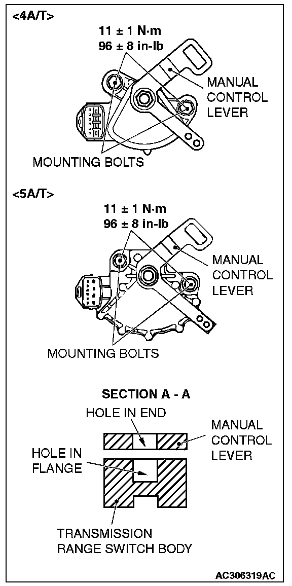 4. Loosen the transmission range switch body mounting bolts and turn the park/neutral position switch body so the hole in the end of the manual control lever and the hole (section A - A in the figure on the left) in the flange of the transmission range switch body flange are aligned.