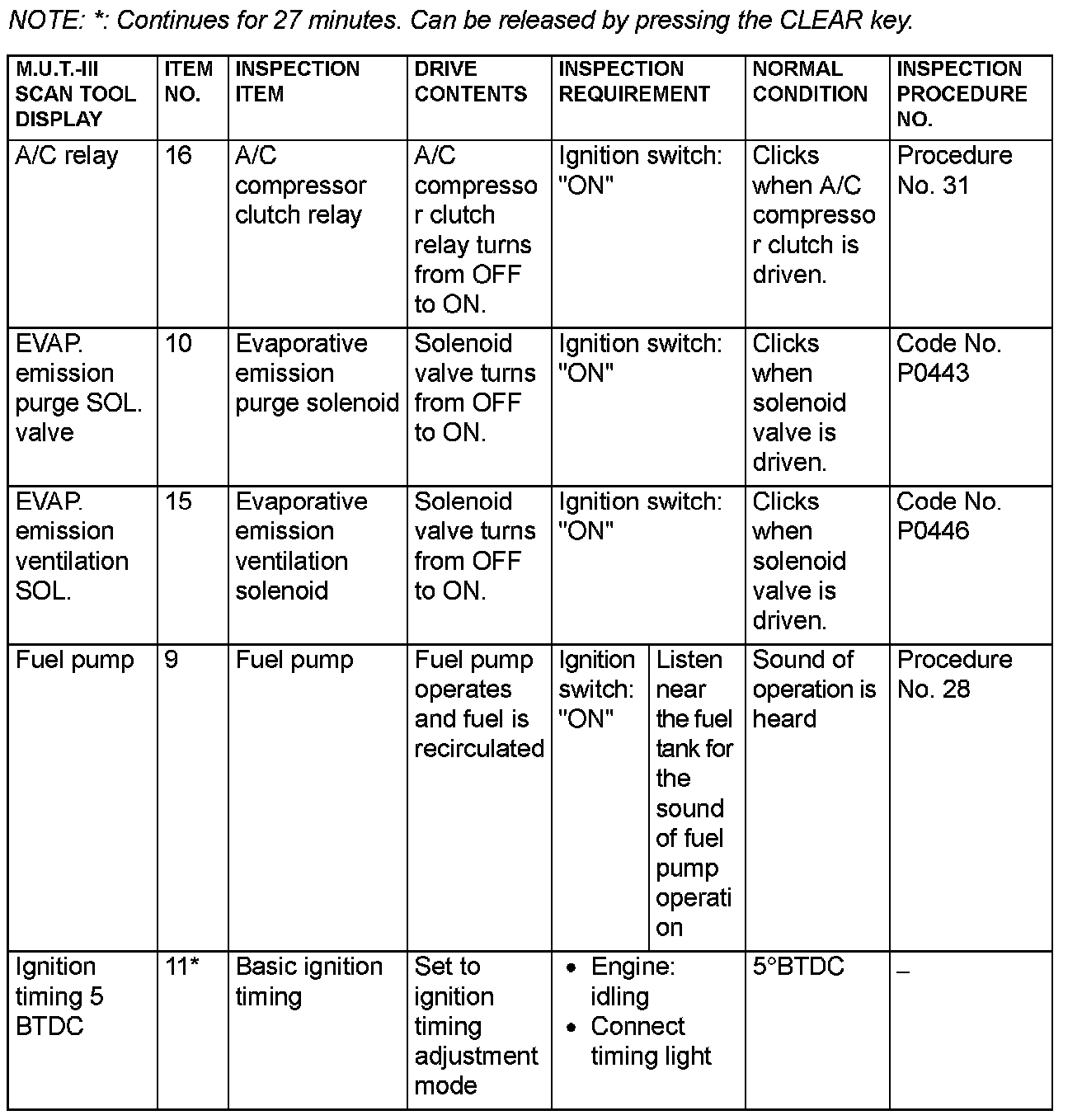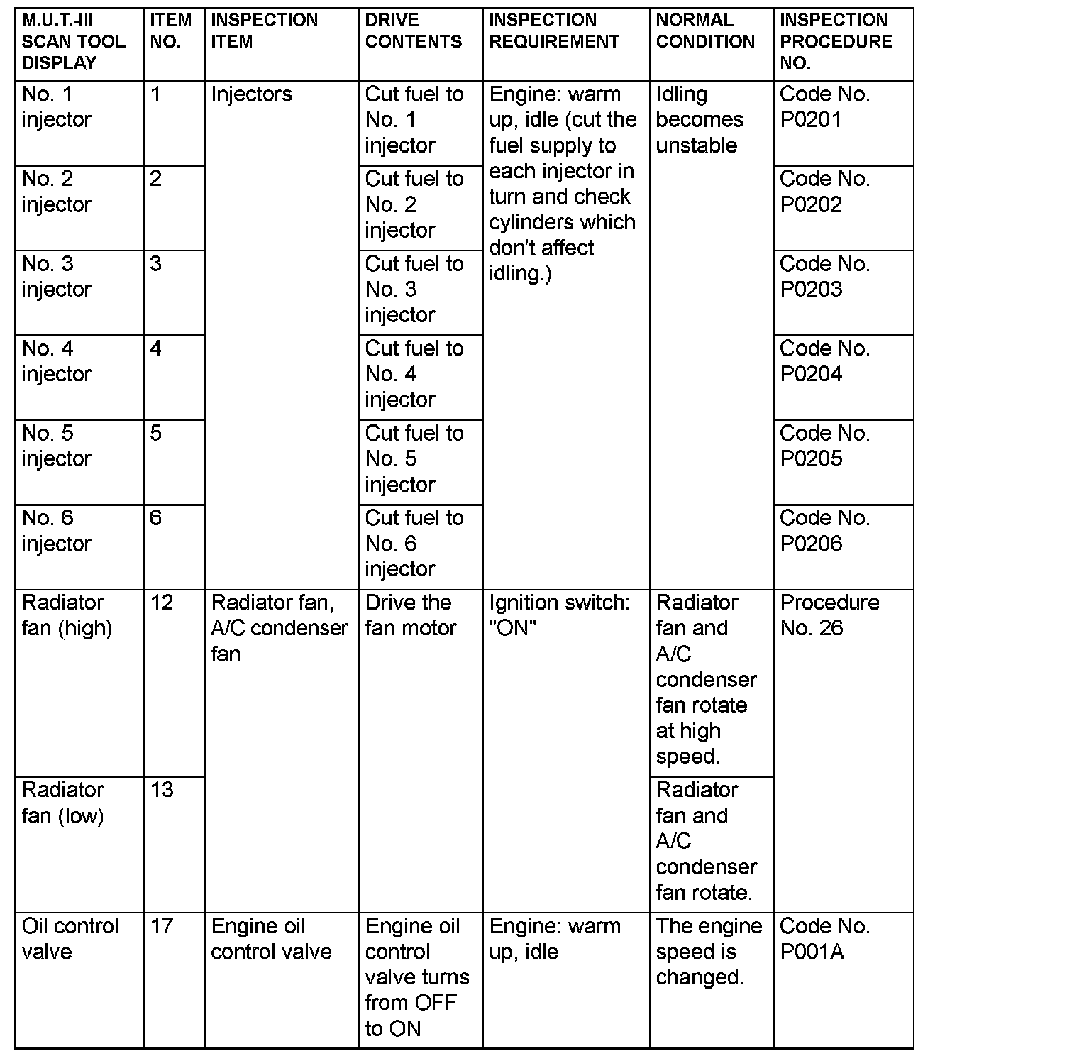 Actuator Test Reference Table (Part 2):