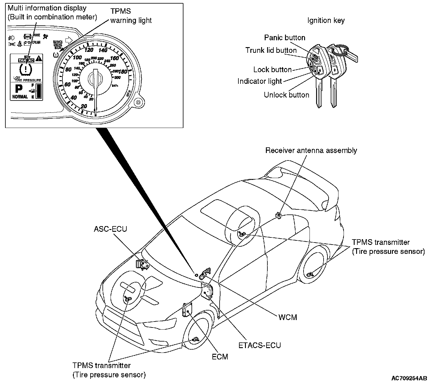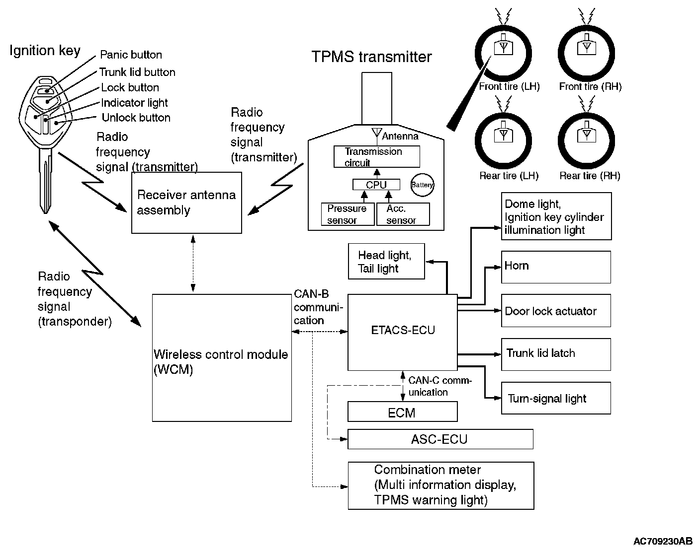 NOTE: In case of replacement of WCM, all keyless ID, key ID and tire pressure sensor ID should be re-registered using scan tool MB991958 (M.U.T.-III sub-assembly).