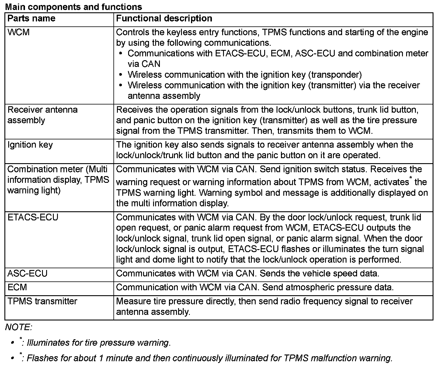 GENERAL INFORMATIONThe wireless control module (WCM) is a system that integrates the keyless entry function, with which remote operation (opening/closing of all doors, opening of trunk lid, and operation of warning function that warns a person who intends to damage the vehicle *), can be performed by operating the lock/unlock button, trunk lid button or panic button on the ignition key (transmitter). Also, WCM incorporates the immobilizer function, which prohibits the starting of engine using an unauthorized key, and the tire pressure monitoring system (TPMS), which issues a warning to a driver by illuminating or flashing the warning light if an abnormality to the tire pressure or the system error is detected. WCM has the following features: