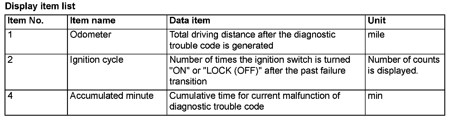 When detecting fault and storing the diagnostic trouble code, the ECU connected to CAN bus line obtains the data before the determination of the diagnostic trouble code and the data when the diagnostic trouble code is determined, and then stores the ECU status of that time. By analyzing each data from scan tool MB991958 (M.U.T.-III sub assembly), the troubleshooting can be performed more efficiently. The displayed items are as the table below.