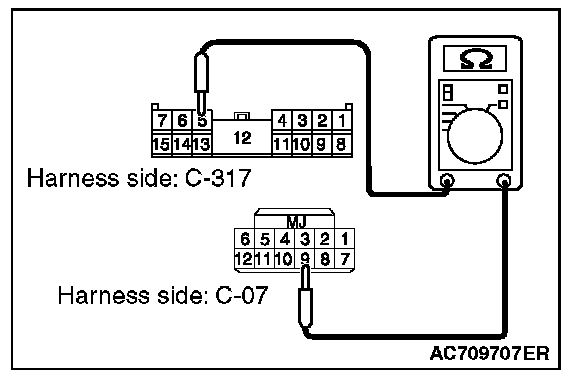 3. Check the wiring harness between WCM connector C-07 (terminal No.9) and ETACS-ECU connector C-317 (terminal No.5)