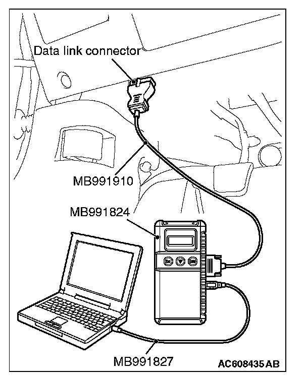 1. Connect scan tool MB991958. Refer to "How to connect scan tool (M.U.T.-III)." How to Connect the Scan Tool (M.U.T.-III)