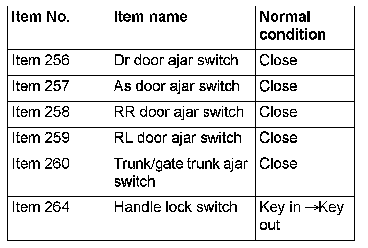 NO [Normal condition is not displayed for item No.260.]: Refer to Inspection Procedure 9: ETACS-ECU does not receive any signal from the trunk lid latch. Inspection Procedure 9