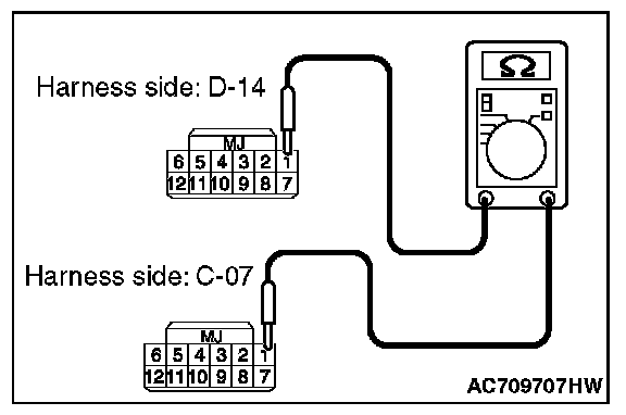 NO (receiver antenna assembly connector D-14 terminal No.1 - WCM connector C-07 terminal No.1.): Repair the wiring harness between receiver antenna assembly connector D-14 (terminal No.1) and WCM connector C-07 (terminal No.1).