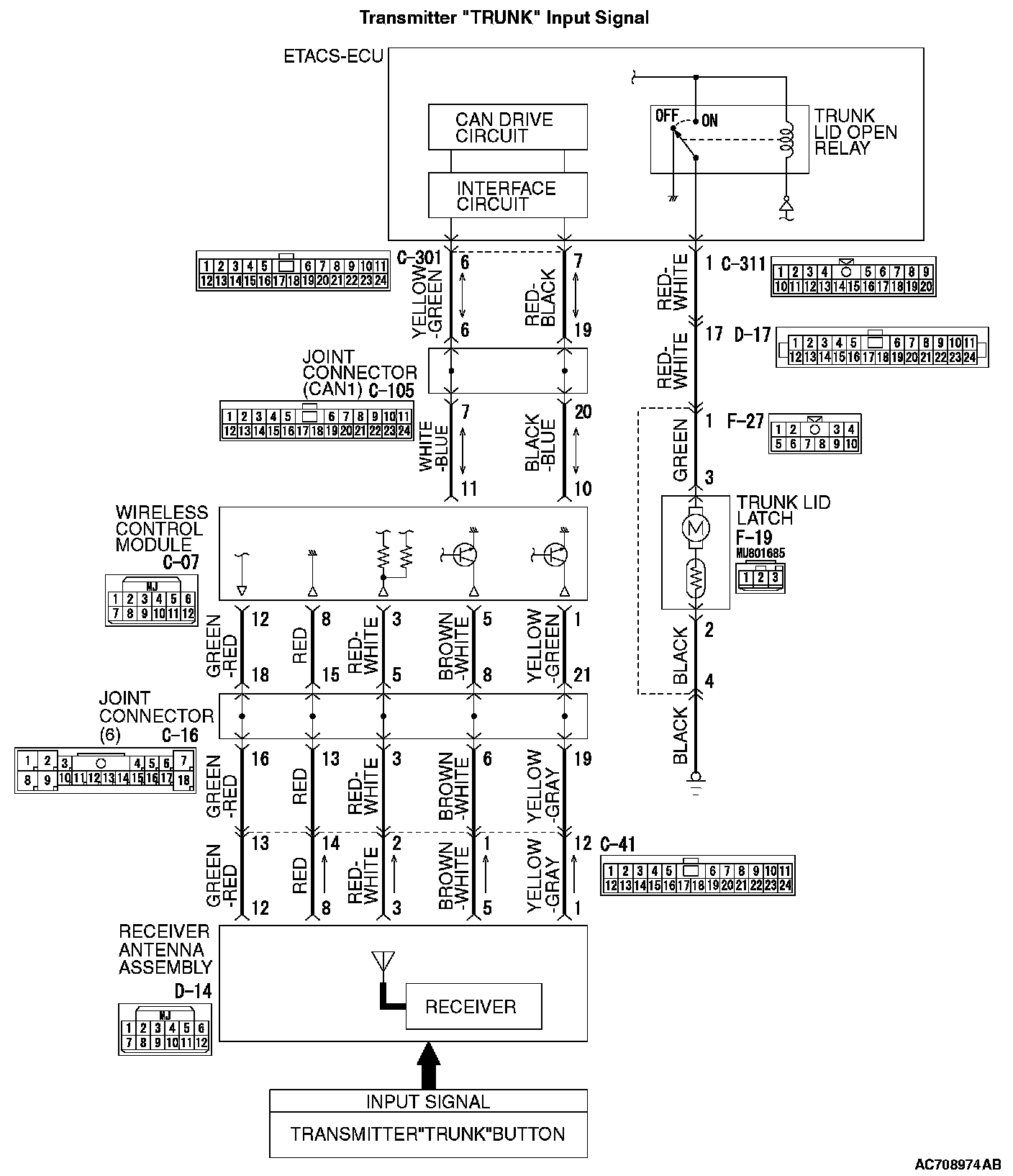 The receiver antenna assembly receives the trunk signals from the transmitter, and sends them to the WCM, and further to the ETACS-ECU. Then the ETACS-ECU determines to actuate the trunk open function of the keyless entry system.