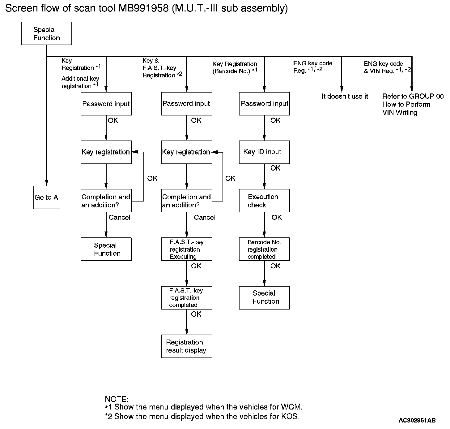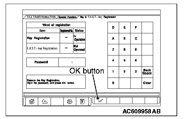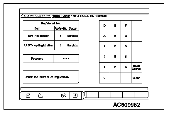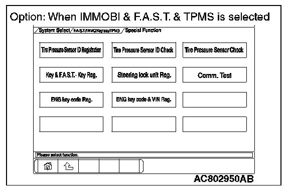 By operating the scan tool MB991958 (M.U.T.-III sub assembly) screen, the ID code registration and the TPMS can be registered and antenna communication required to the keyless operation system can be performed. KOS and keyless operation key are indicated as F.A.S.T and F.A.S. T.-key respectively in the scan tool MB991958 (M.U.T.-III sub assembly) screen.